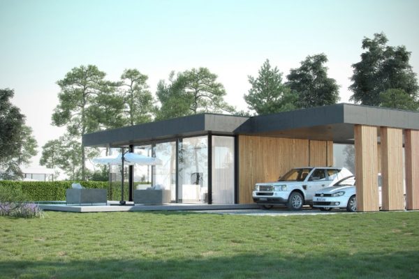 Jednoduchá kompozice objektu s přirozeným výrazem. Rodinný dům tvořený pohledově z přírodních materiálu – vyvážená kombinace dřeva a skla nabídne majitelům vysoce komfortní životní styl.